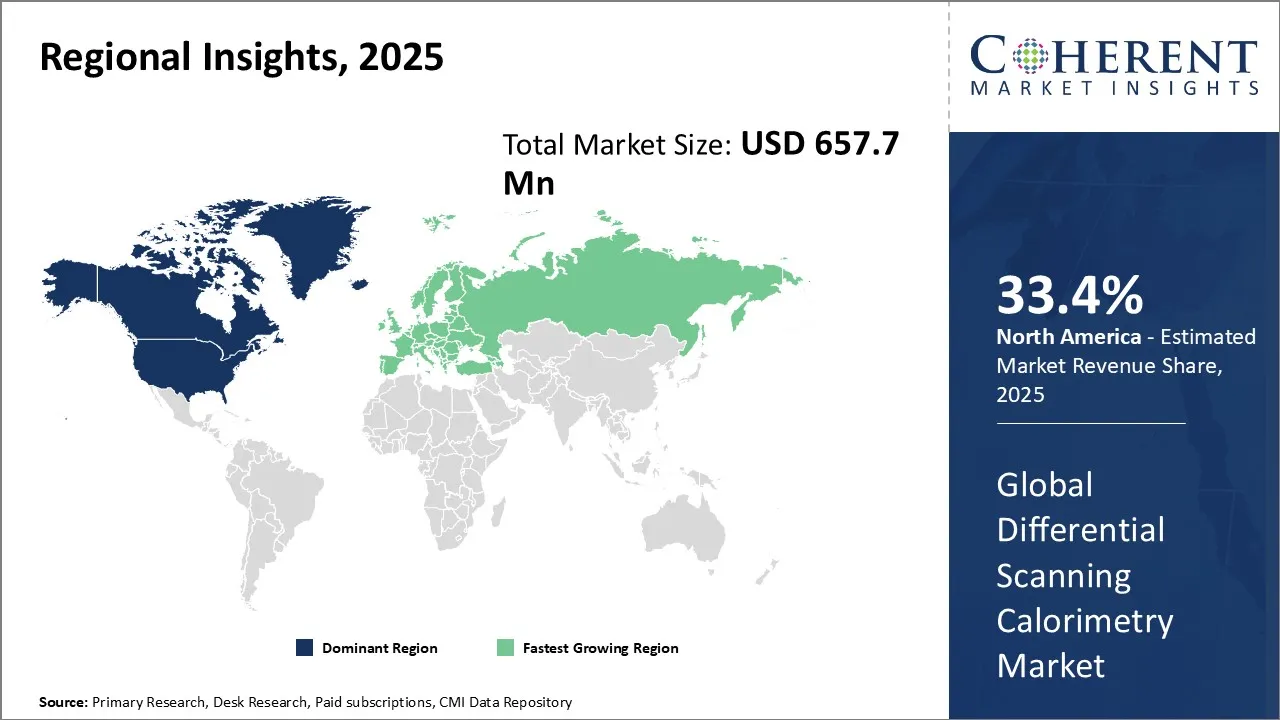 The North America region is projected to lead the market with a 33.4% share in 2025, primarily driven by a well-established industrial ecosystem, advanced research infrastructure, and favorable government policies that support scientific innovation. The region is expected to grow at a CAGR of 11.55%. The region hosts numerous pharmaceutical, polymer, and chemical companies that rely heavily on DSC technology for product development and quality control.