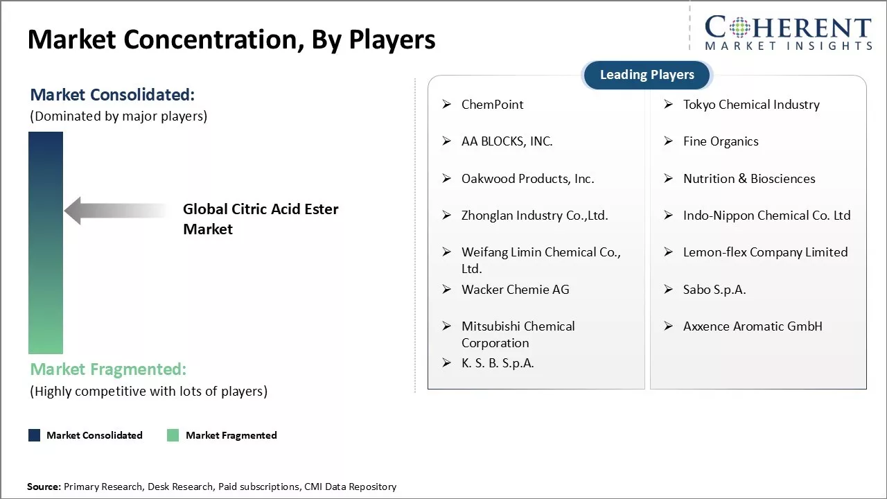 This market is facing challenges due to fluctuations in raw material prices impacting production costs for manufacturers. Citric acid esters are manufactured using citric acid as the primary raw material. However, citric acid prices have witnessed strong volatility in recent years due to various factors such as uncertain weather conditions impacting lemon production and global supply demand dynamics. As citric acid accounts for a major portion of the overall production costs for citric acid ester manufacturers, frequent price swings in citric acid are directly impacting the costs and profit margins for these players.