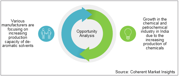 Various manufacturers are focusing on increasing production capacity of de-aromatized in order to expand their presence in India. This is expected to offer potential growth opportunities in the near future. For instance, Exxon Mobil expanded its production capacity by 250,000 tons for global hydrocarbon solvents. It produces a range of de-aromatic solvents in its facilities located in Singapore and Antwerp.