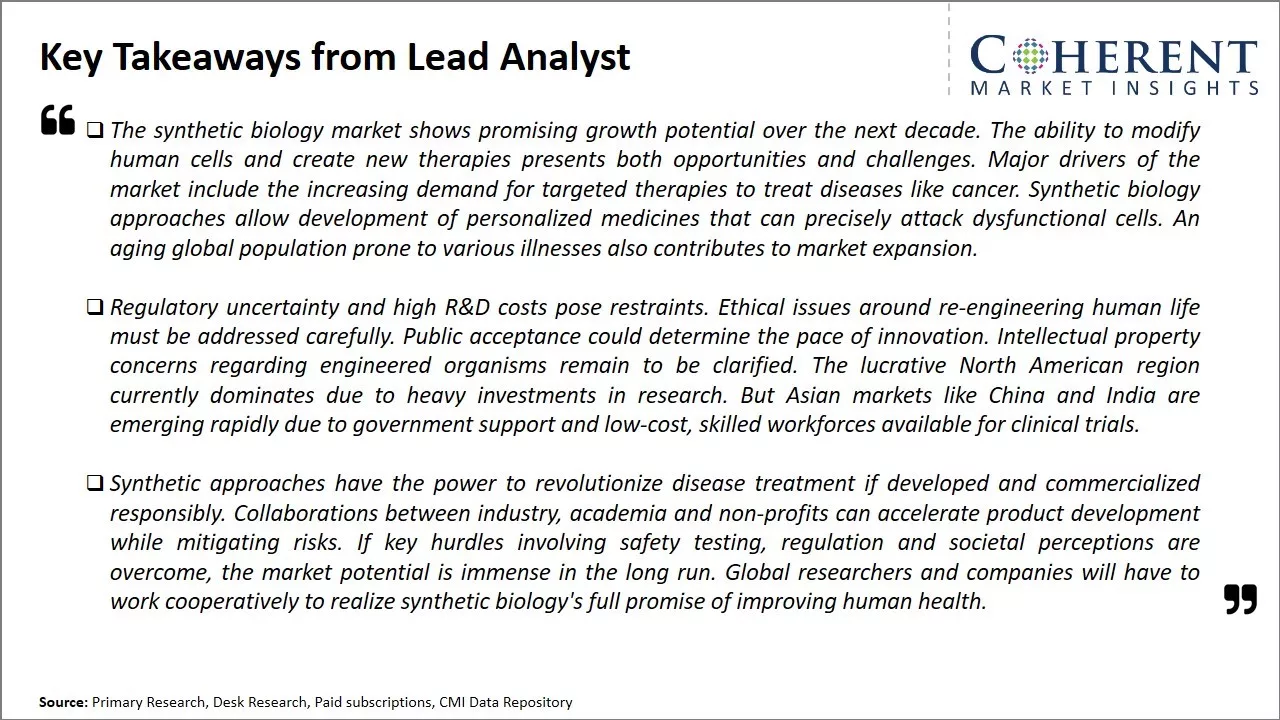 Cost effectiveness and regulatory barriers are noted as concerns by some clinics, though overall synthetic biology adoption is on the rise. Biotechnological and pharmaceutical companies stress the importance of synthetic biology’s capabilities in drug discovery, biomanufacturing, and personalized therapeutics.